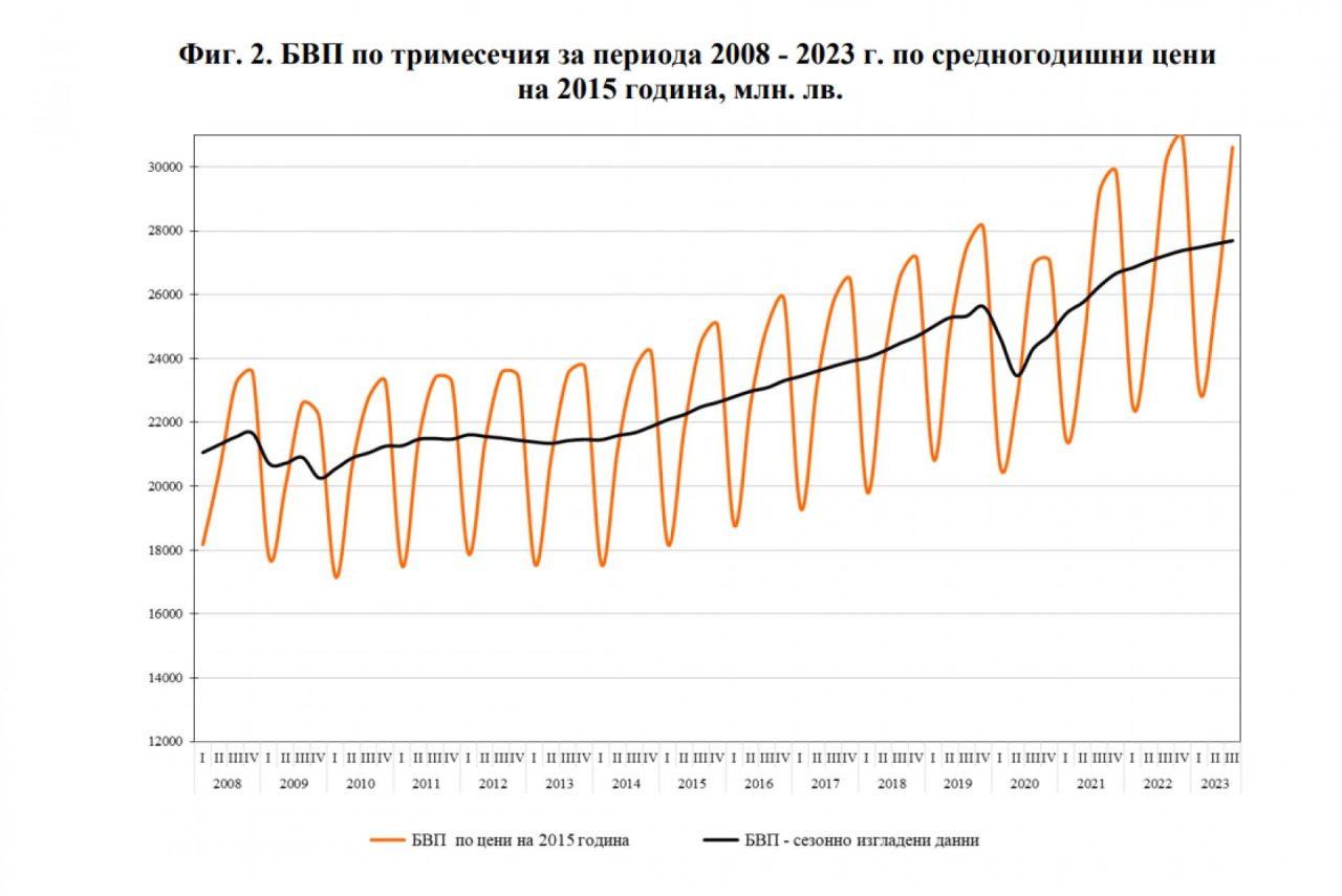 Това беше предизвикано както от печатането на пари от Европейския съюз за Зелена сделка и пропаганда в полза на съюза, така и от неразумната политика на предходните няколко правителства, които увеличаваха без икономическо основание, а само по популистки подбуди, всички разходи. Минималната заплата вече винаги е 50% от средната, но тъй като средната заплата постоянно расте, защото в нейното определяне е включена и минималната (рекурсивна функция), този растеж е безкраен и неоправдан – просто се надуват ежегодно заплатите, без увеличаване на производството и печалбите на компаниите. Това води и до нужда от ръст на пенсиите, социалните плащания и други помощи и т.н. (Вижте двете графики по-долу и сравнете кривата на ръста на средната заплата и на Брутния вътрешен продукт.) Недалновидно беше и е предлагането на безплатни услуги, платени от данъците ни, като например безплатни детски градини и т.н. Растящите заплати ни правят вече да не сме конкурентен пазар за ниско и средноквалифицирана работна ръка.