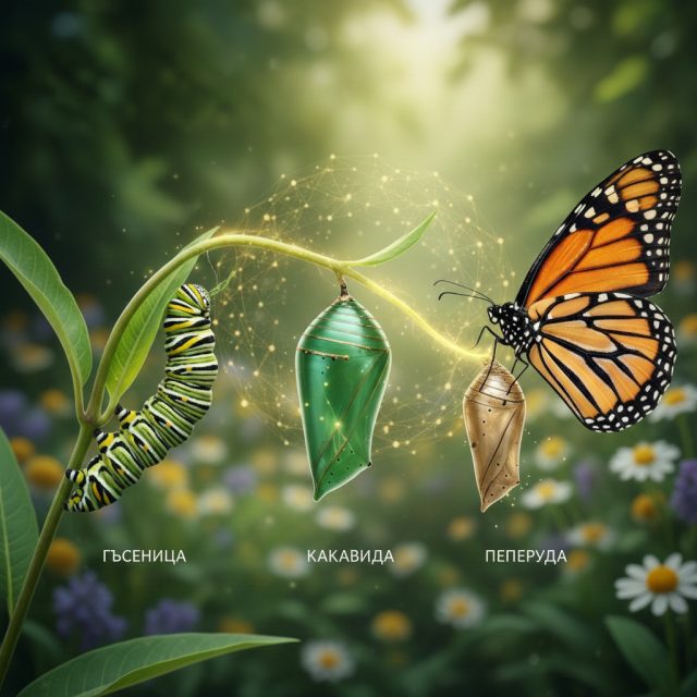 Когато гъсеницата влезе в какавидата, тя отделя ензими, които буквално втечняват цялото ѝ тяло. Тя се превръща в протеинова „супа“. Всички органи и мускули изчезват. И точно в този момент на пълен хаос започват да работят т.нар. „имагинални дискове“ – клетки, които носят чертежа на пеперудата. Те използват течността, за да изградят крила, нови очи и нова нервна система.